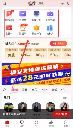 3、首頁提供訂閱優(yōu)惠、數(shù)據(jù)統(tǒng)計、賽事分析、精選方案、套餐卡與計劃單服務。