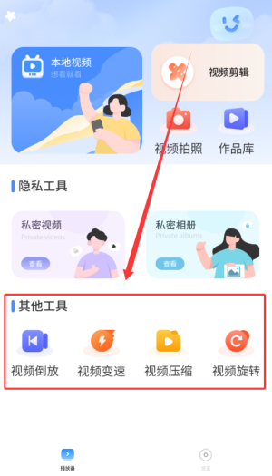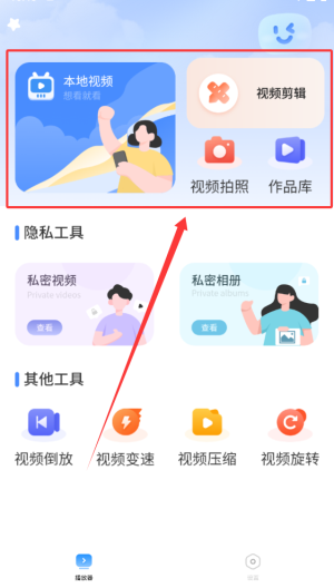2、首頁提供本地視頻瀏覽、剪輯處理、拍攝錄制及作品庫管理功能。