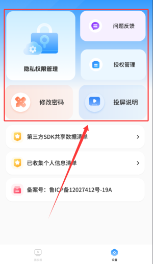 4、設(shè)備設(shè)置包含隱私權(quán)限管理、登錄密碼修改、問題反饋及投屏說明。