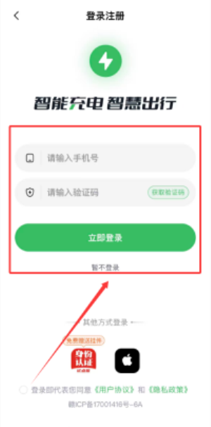 1、通過輸入手機(jī)號碼及短信驗證碼,可完成充電服務(wù)平臺賬戶的登錄驗證。