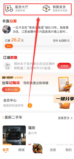 4、該頁面還提供二手車交易信息、貨運大廳瀏覽及發(fā)貨需求發(fā)布功能。