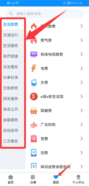 3、在便民頁面,可按需選擇生活繳費、交通出行等各項分類。