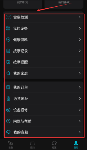4、我的頁面集中管理健康檢測數(shù)據(jù)、設(shè)備信息、個人檔案及按摩記錄。