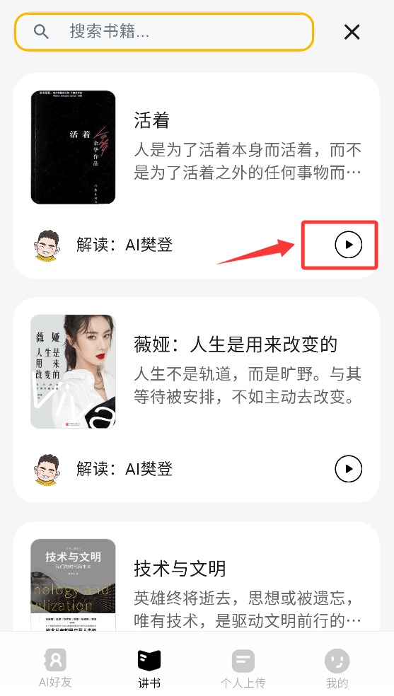 帆書智能版提供樊登老師系列書籍的聽講與閱讀服務,匯集親子家庭、個人成長、人文歷史等領(lǐng)域的講書資源。平臺支持按章節(jié)選聽,并設(shè)有AI問答助手,便于隨時解惑,助力高效學習與認知提升。