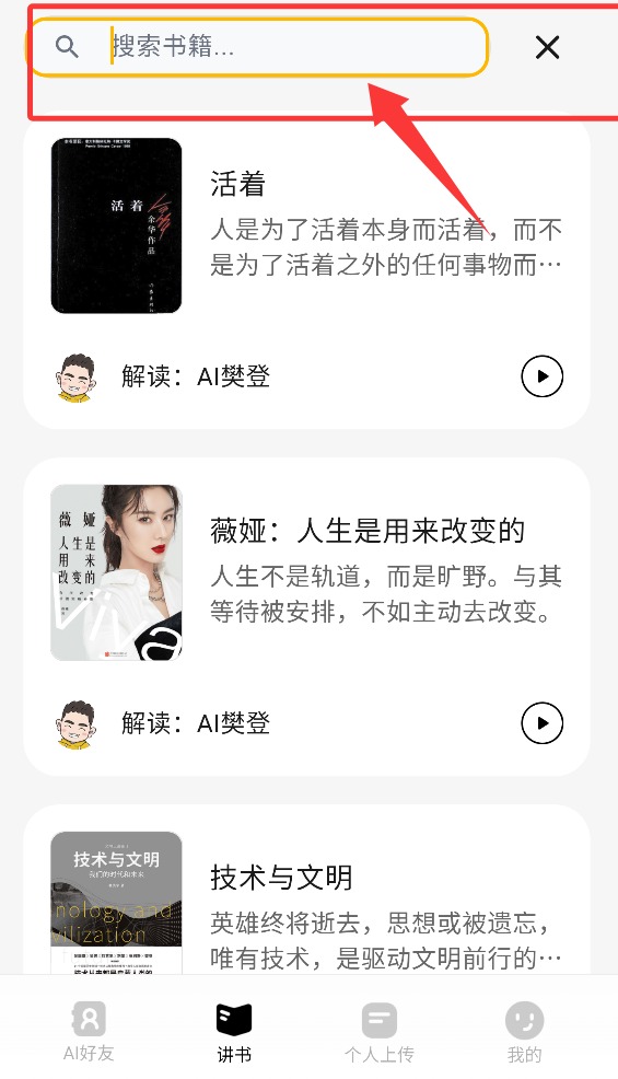 4、通過搜索書籍工具可快速查找特定作品或作者,系統(tǒng)將展示相關(guān)有聲書與電子書資源。